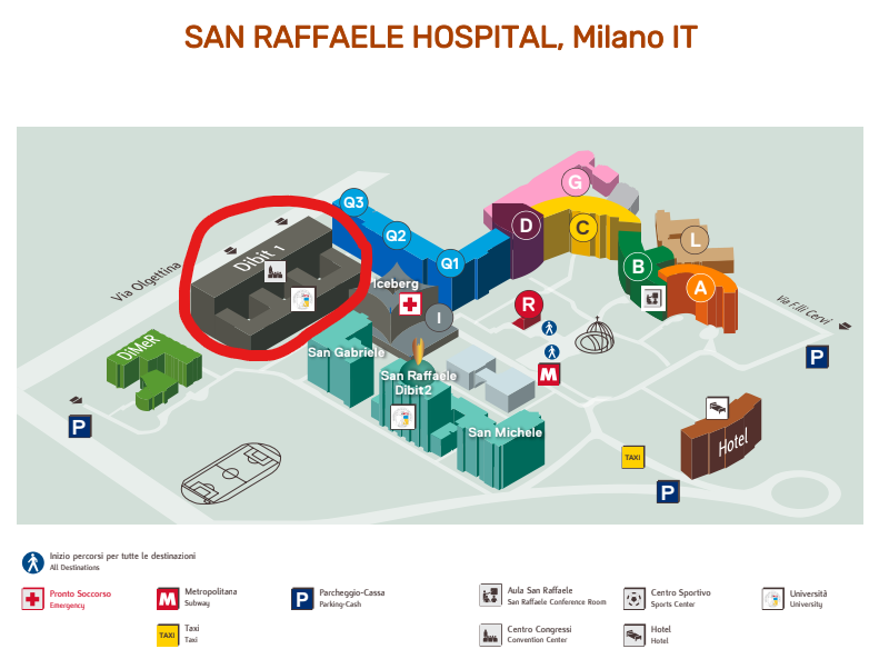 - Il Centro Congressi San Raffaele è raggiungibile in 15 minuti in taxi oppure con la linea 2 verde della metropolitana (M2) fino a Cascina Gobba e poi con il servizio navetta del tram per la stazione Ospedale San Raffaele (è necessario un biglietto aggiuntivo in quanto non sono validi biglietti ATM e abbonamenti).
